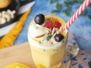 Serving glass ki rim per lemon laga ker bareek cheeni laga lein.