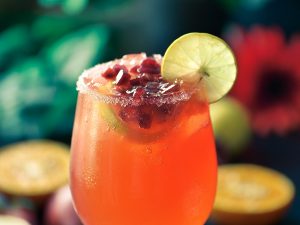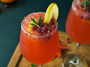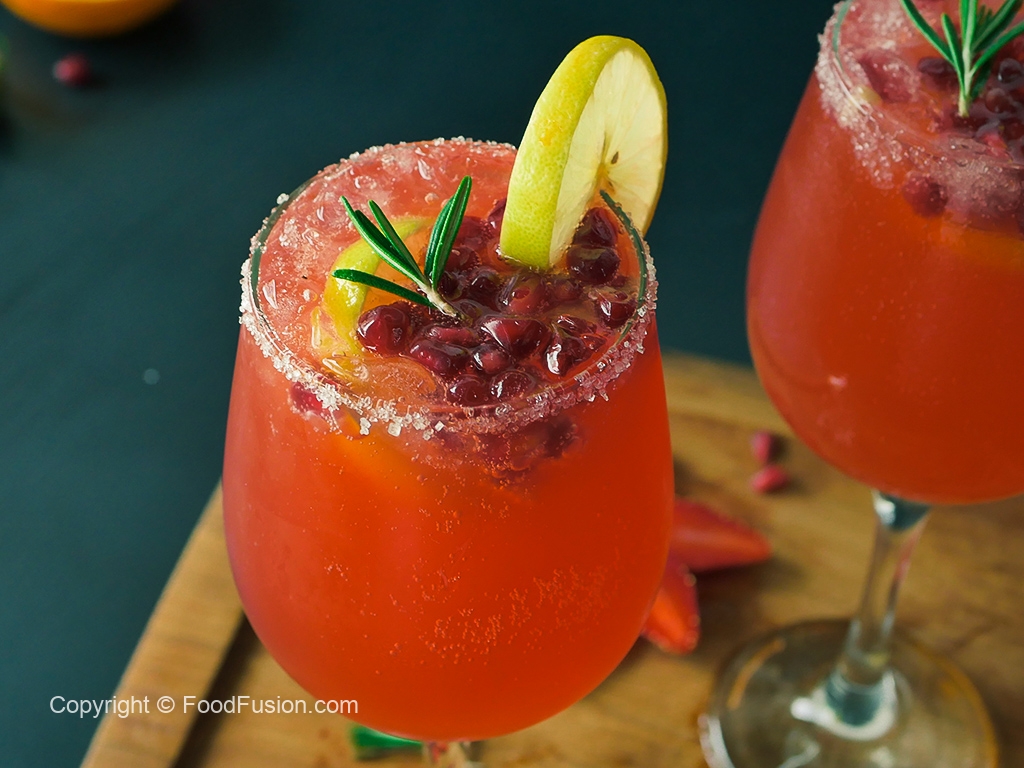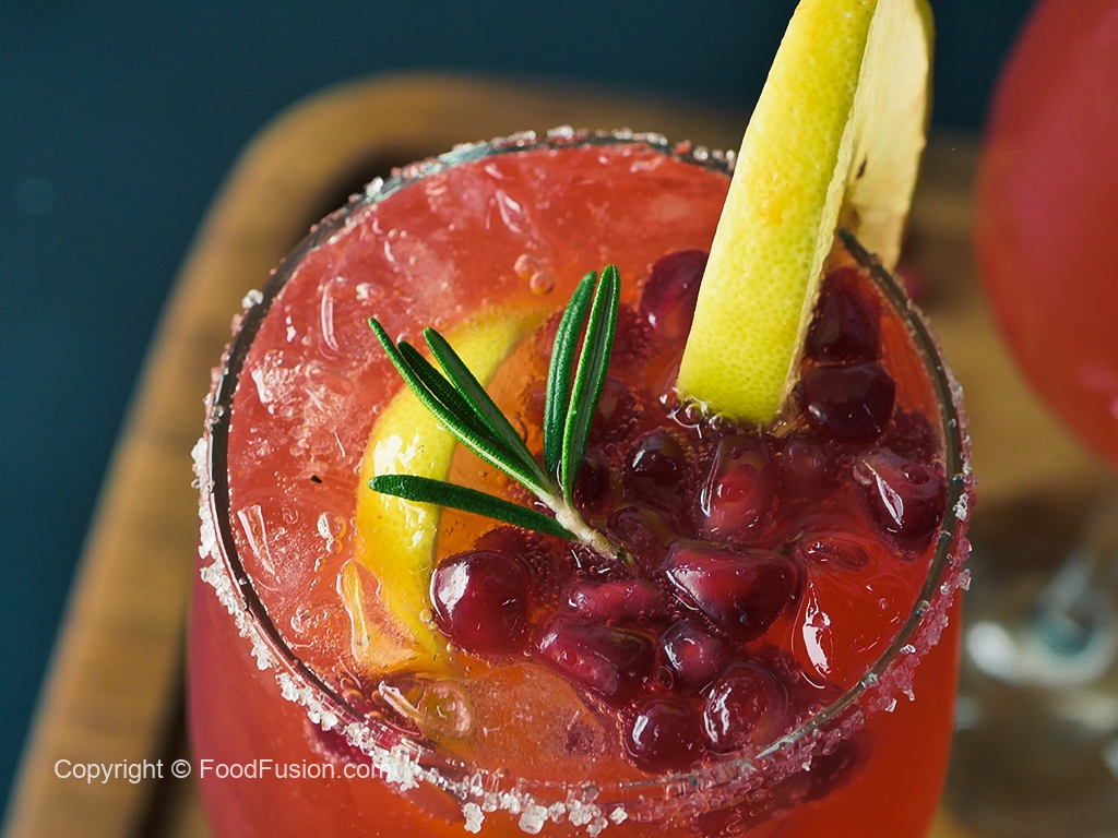 Add crushed ice,prepared juice,7up & garnish with lemon slice,pomegranate,rosemary leaf & serve!