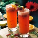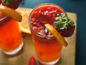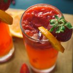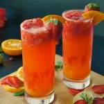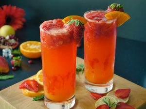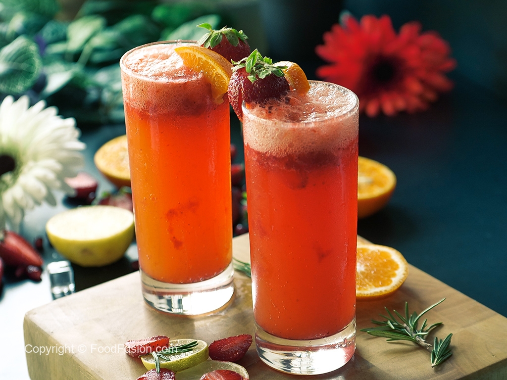 Serving glass mein crushed ice,pureed strawberries (2-3 tbs),crushed strawberries (2-3 tbs),orange juice (1/4 Cup) aur 7up dal dein, orange aur strawberry sa garnish ker ka serve karein!