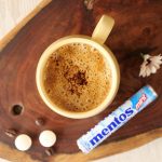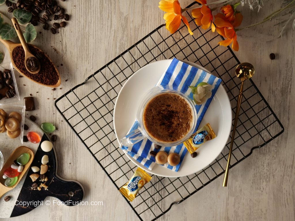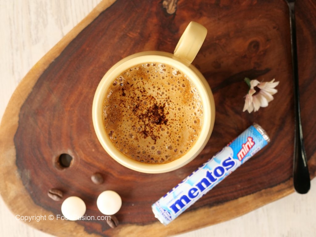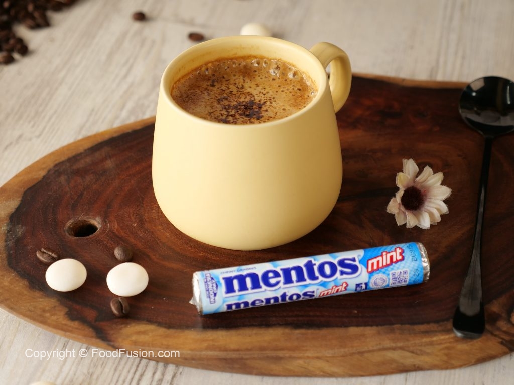 -Serving cup mein tayyar coffee mixture (1-2 tbs),1 cup hot mentos flavored milk dal ker ache tarhan mix ker lein.