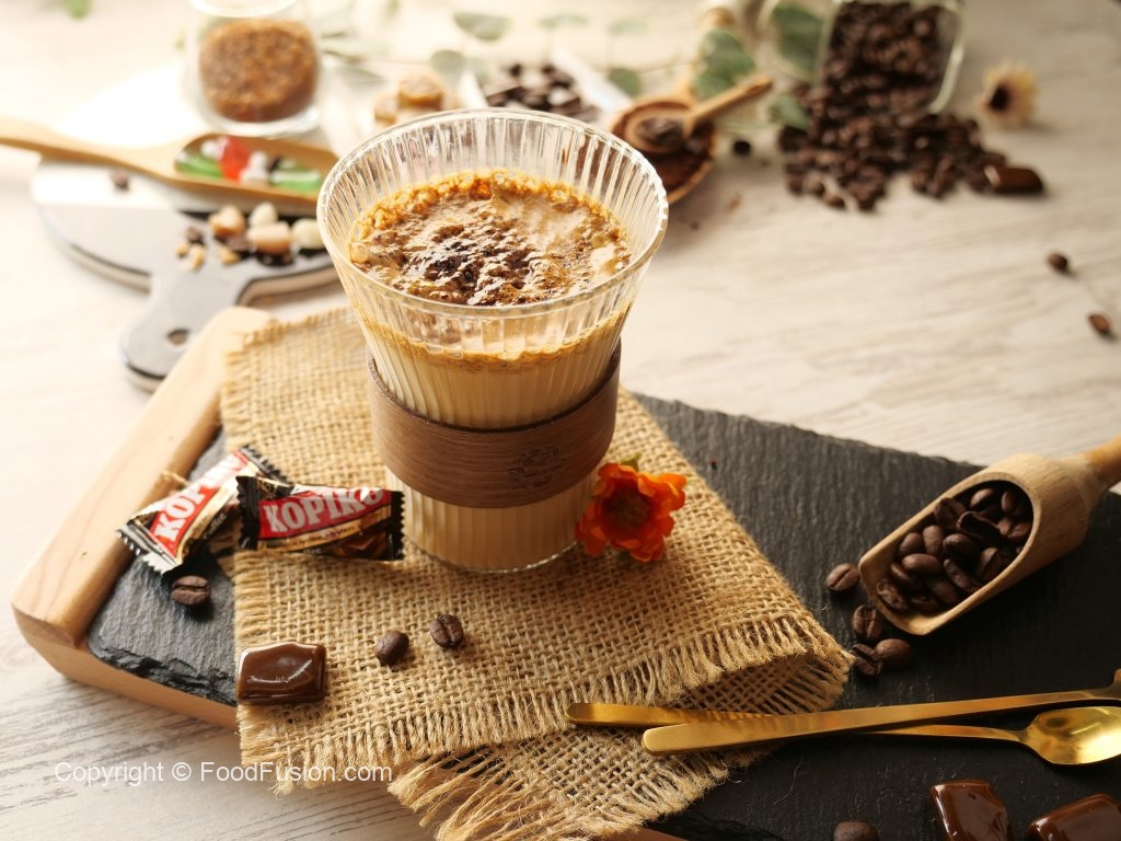 -Serving cup mein tayyar coffee mixture (1-2 tbs),1 cup hot kopiko flavored milk dal ker ache tarhan mix ker lein.