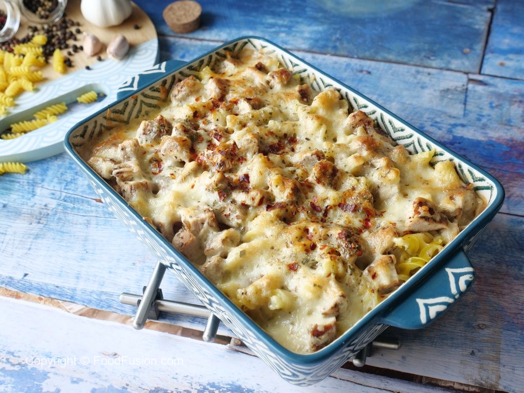 Grease baking dish with oil,add boiled spiral pasta,pour alfredo sauce,add chicken cubes and stir slightly.