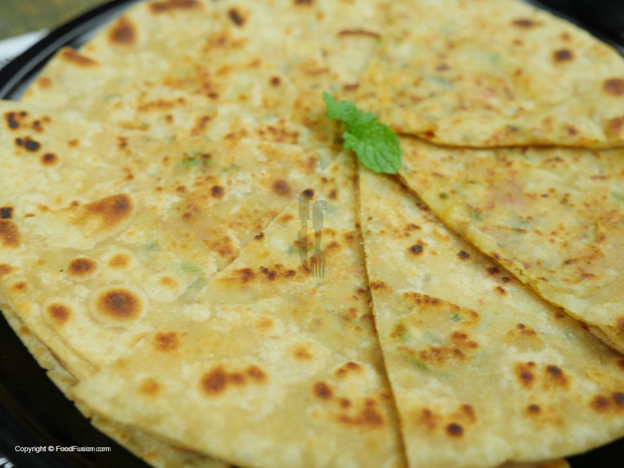 Roll out another dough and put filling/stuffing in the center, place another round dough on top, seal edges and roll out carefully with the help of rolling pin.
