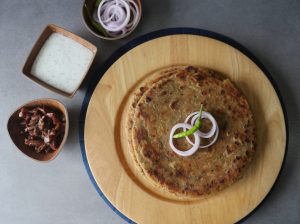 Knead dough again,take a small dough,grease hands with oil and make a ball,sprinkle dry flour,add & spread cooking oil and roll out with the help of rolling pin.
