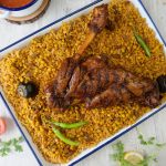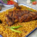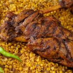 -On a serving platter,add & spread prepared rice,daal & raisins,mutton leg & garnish with green chillies & serve!