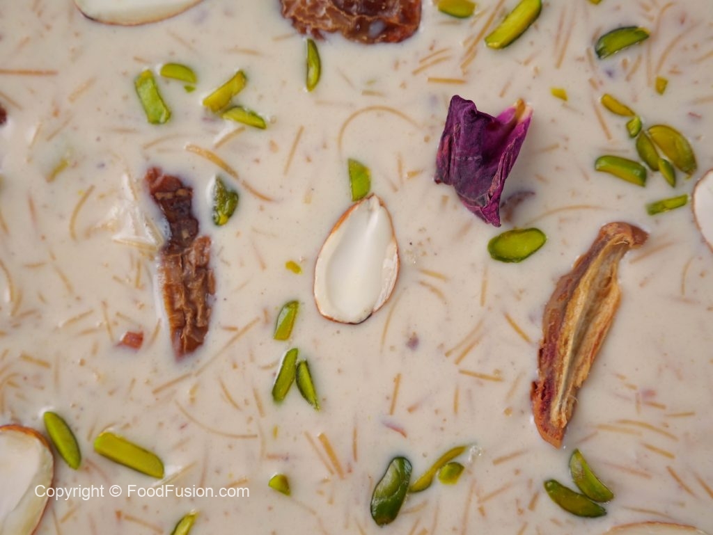 -In a serving dish, add badami sheer khurma, garnish with pistachio, almonds, dried rose petals & serve!