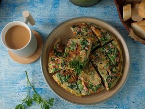 Serving plate per omelet ko flip ker lein aur slices mein cut ker ka serve karein!