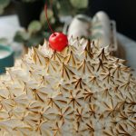 Apply thin layer of prepared meringue all over the cake and decorate with meringue flowers.