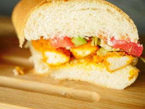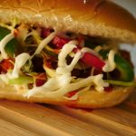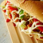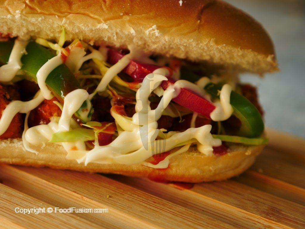 Burger bun per mayonnaise laga ker cooked chicken,tomato ketchup,bund gobhi,tamatar,shimla mirch, mayonnaise aur tomato ketchup dal ker top bun sa cover ker lein & serve karein.