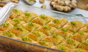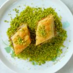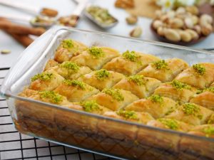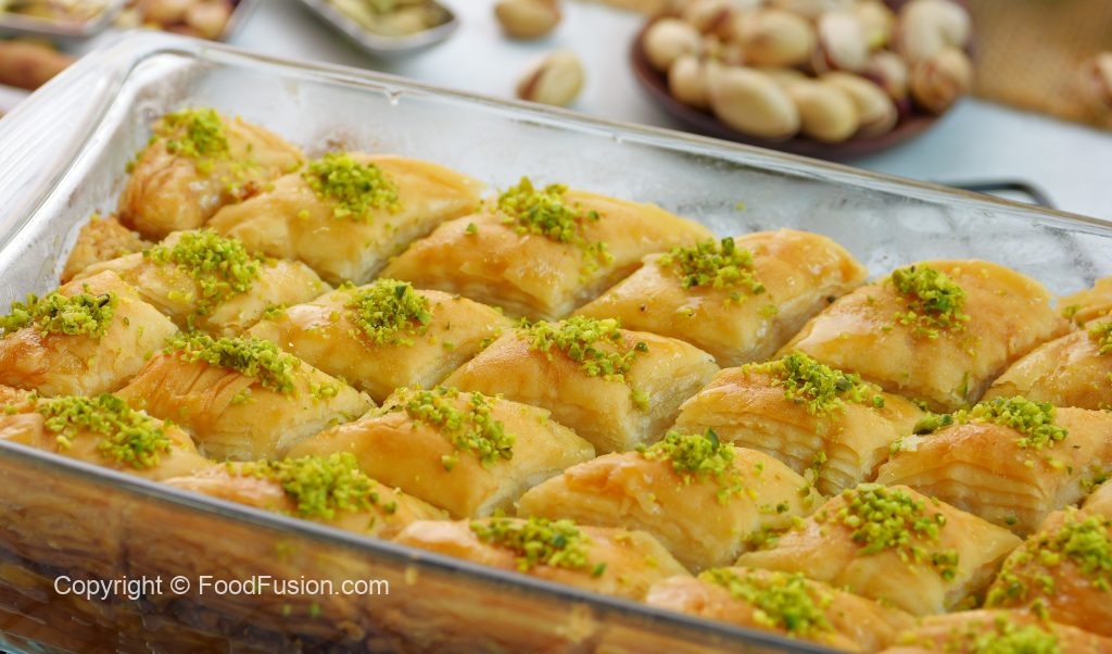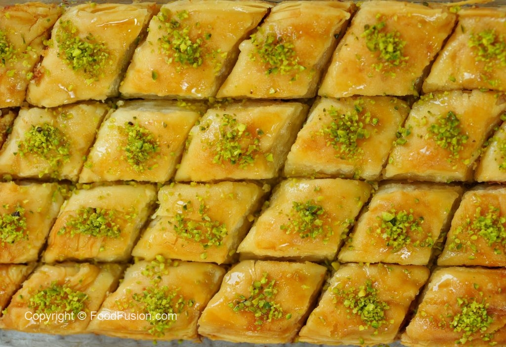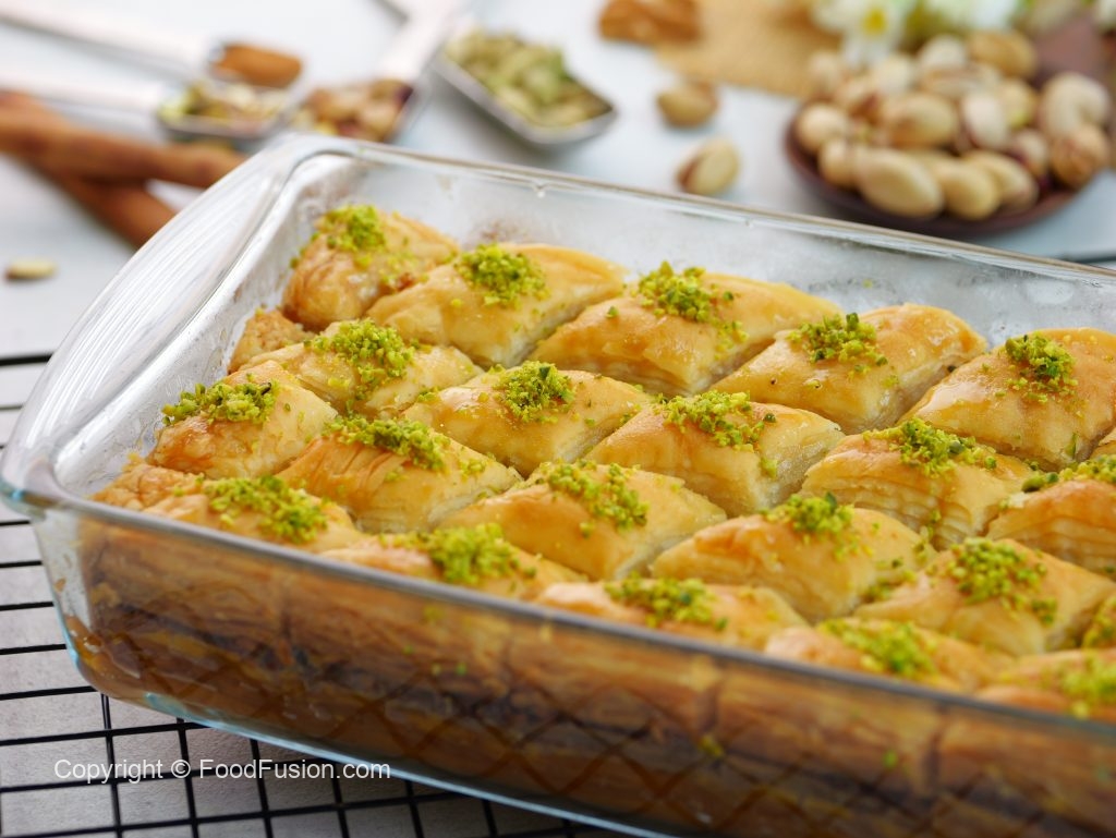 -Cut into diamond or square shapes of bakhlava using a sharp knife & separate the side of pan.