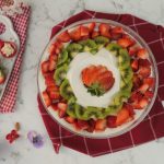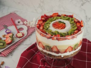 -Add olper’s whipped cream,strawberry puree,add strawberry,pineapple & kiwi slices.