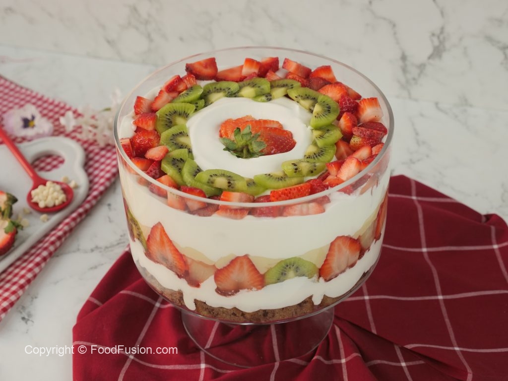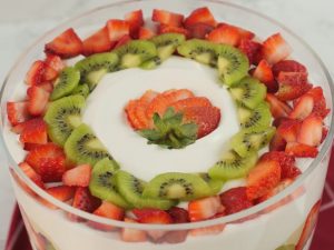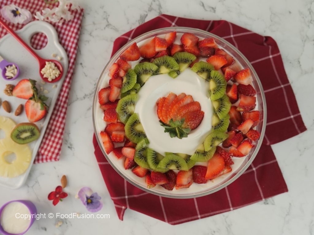 -Olper’s whipped cream aur strawberry puree dal ker pheela lein,strawberry,pineapple aur kiwi ka slices laga lein.