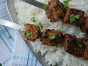-Skewers ko (jaltay hoye koyla) bbq grill per tamam sides sa grill ker lein aur oil basting ker lein.