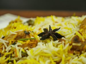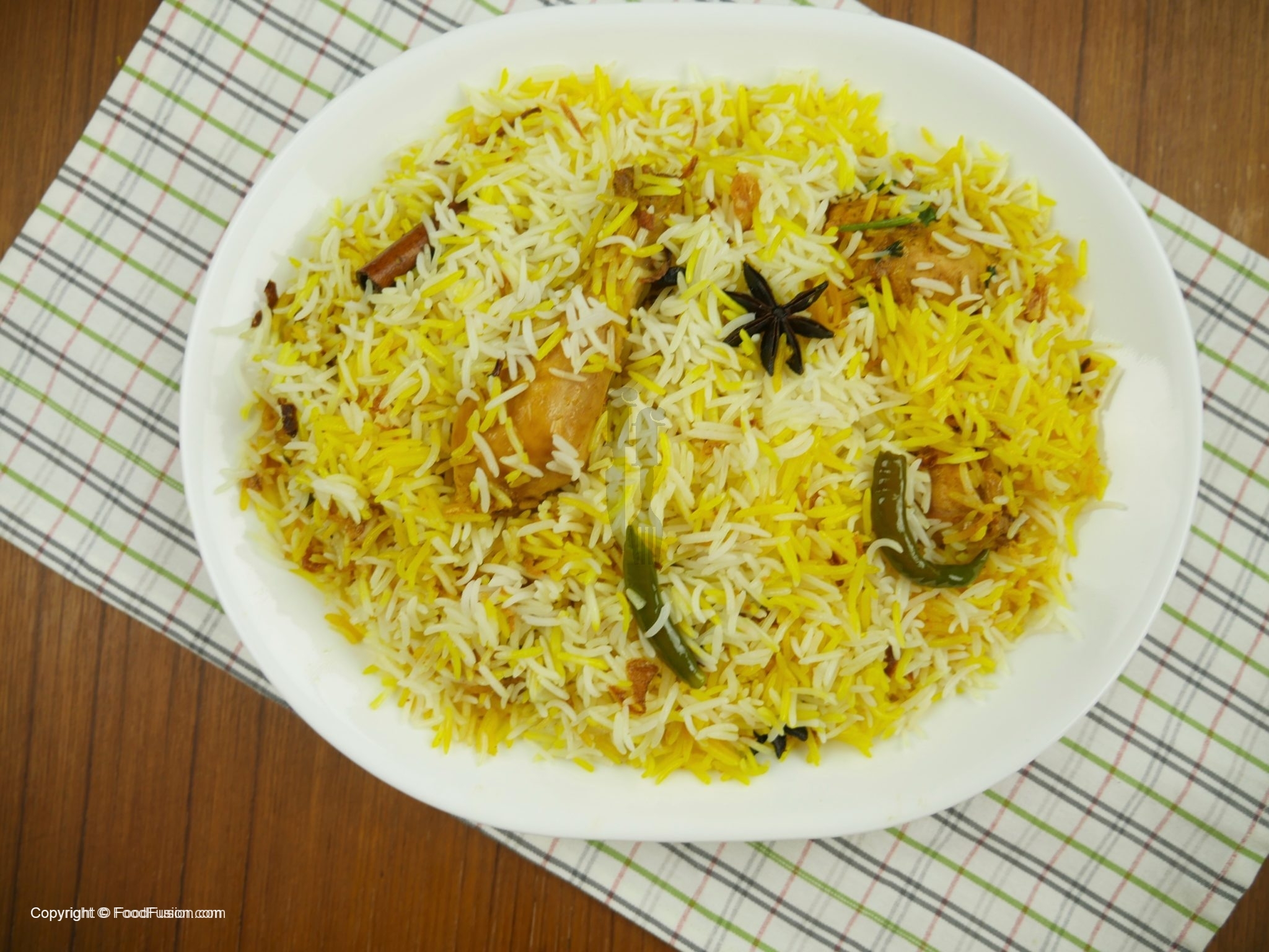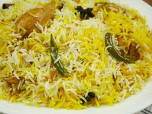 then add the rice and lastly topped with fried onions, coriander, reserved oil from chicken, water & color mixture and finally with kewra.