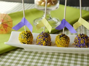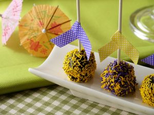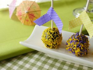 Dip your cake pop sticks into melted cooking chocolate and coat evenly.