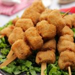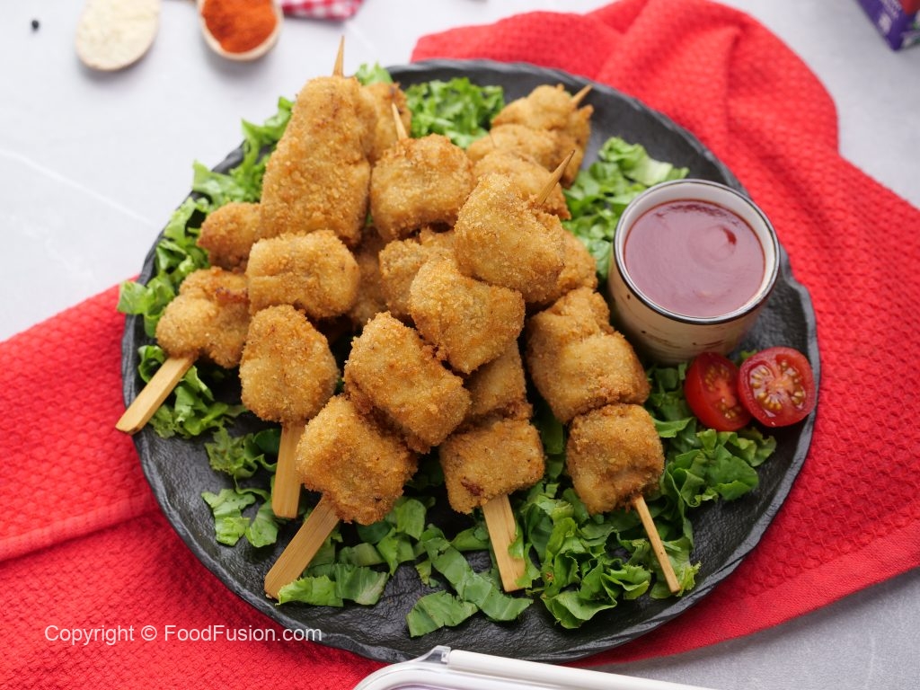 -Coat chicken skewers with all-purpose flour then dip in whisked eggs & coat with breadcrumbs.