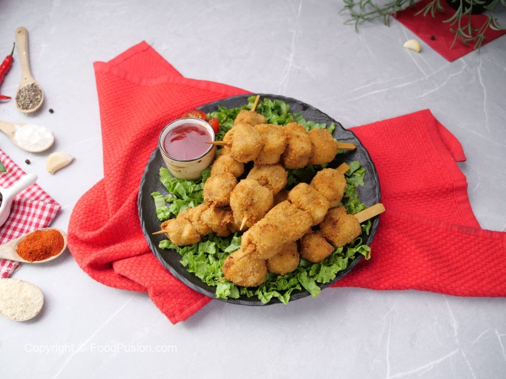 -In a wok,heat cooking oil & fry chicken skewers on low flame until golden brown (makes 8).