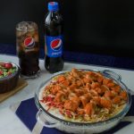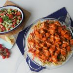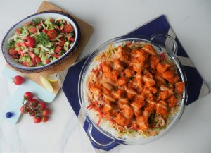 In serving dish,add boiled rice,red chili+garlic tadka,cooked vegetables,cooked tandoori chicken and drizzle prepared sauce & serve!