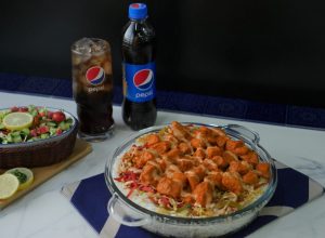 Serving dish mein boiled chawal,lal mirch+lehsan ka tadka,cooked vegetables,cooked tandoori chicken aur tayyar sauce drizzle ker ka serve karein.