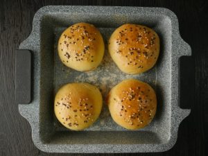 With the help of the brush,apply egg on prepared buns and sprinkle sesame seeds.