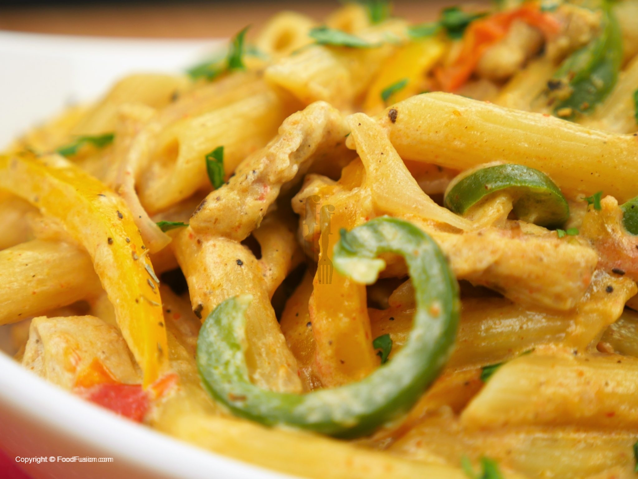 -Karhai mein oil,tamatar,fajita seasoning dal ker tamatar naram hunay tak paka lein,cooked chicken, penne pasta cooked aur vegetables dal ker ache tarhan mix ker ein.