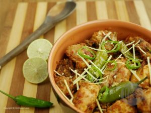Add tomato paste (already prepared) mix well and cover. When chicken is tender and gravy is formed, add crushed cumin, coriander powder, ginger, dried fenugreek, and green chili. Mix well and cover for 5 minutes.