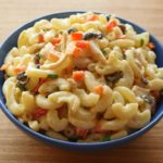 Add elbow macaroni,chicken,carrot,green onion leaves,red bell pepper,black olives,mix well & refrigerate for 2 hours.