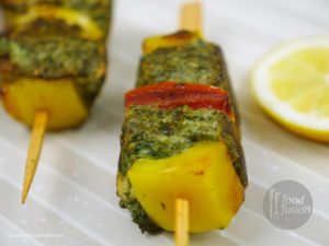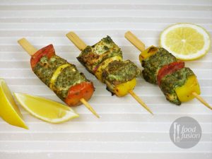 Ab marinated chicken,color bell pepper,tamatar,pyaz aur lemon slices ko skewers per assemble ker lein.