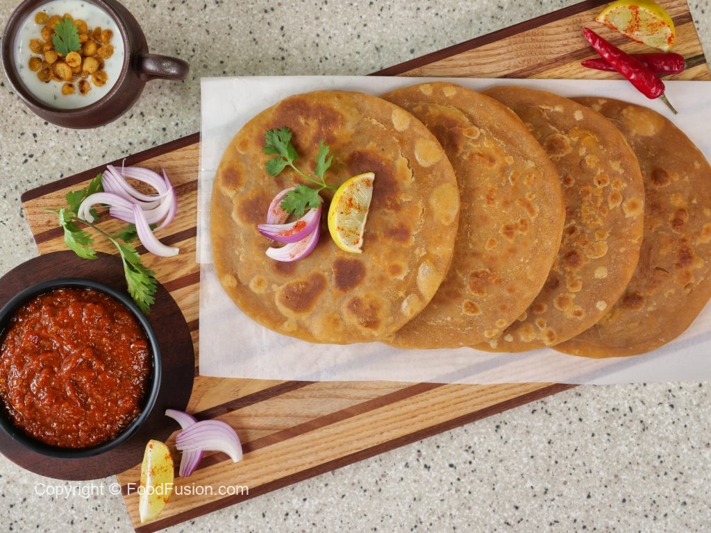 -Heat griddle & fry paratha with clarified butter on medium flame from both sides until golden (makes 9).