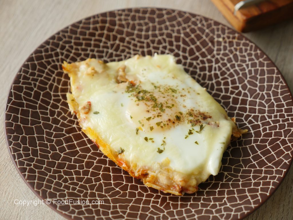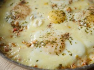 Pakay hoye mixture ko evenly pheela lein aur holes bana lein phir ek,ek ker ka anday shamil karein aur namak,kali mirch powder aur dried parsley chirak dein aur halki ancch per 2 minutes kliya paka lein.