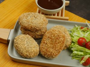 -Bread slice rakh kar uske edges trim karen, tamam corners ko achi tarah chop karen, bread crumbs tayar hain, side par rakh den.