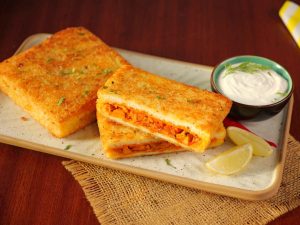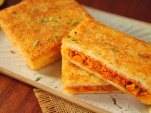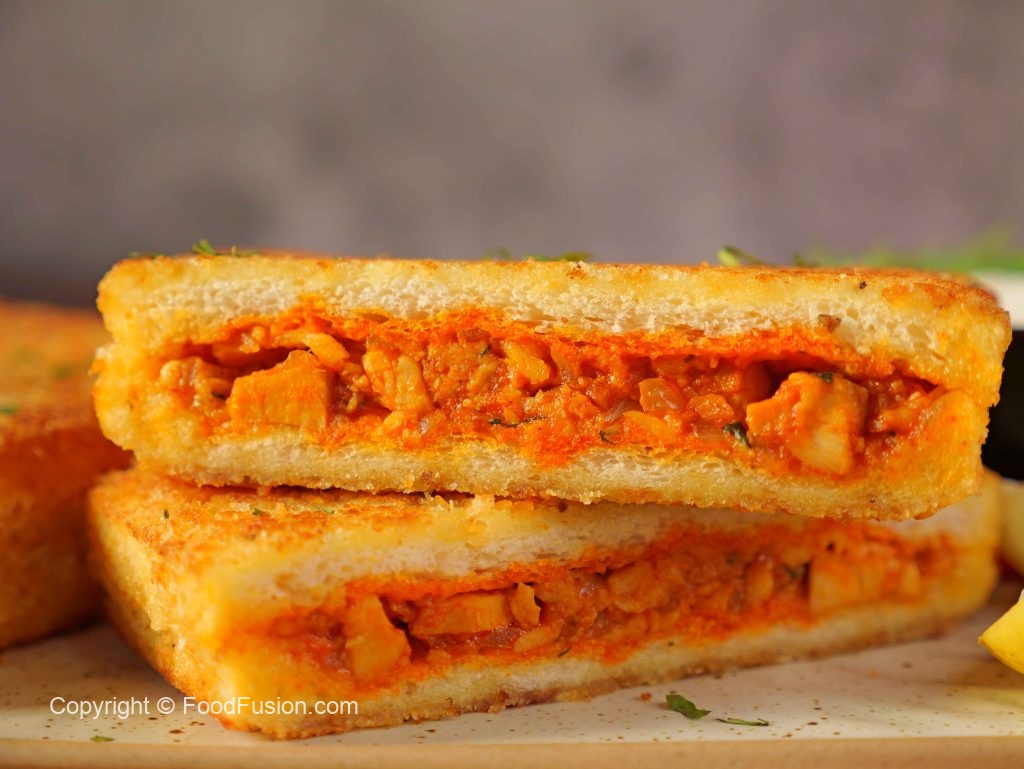 -Aik bread slice par tayar chicken tikka mixture dalein aur evenly spread karen, doosri bread slice se cover karen aur spatula se press karen.