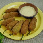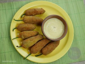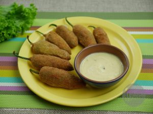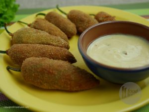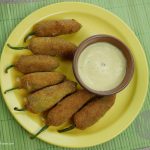 Take out chilies from water and pat dry them. Put a chicken slice and cheese inside the chilies and set aside.