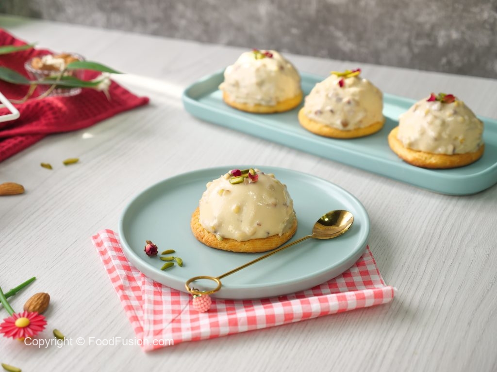 -Pista aur badam dal ker gently fold ker lein aur piping bag mein transfer ker lein.