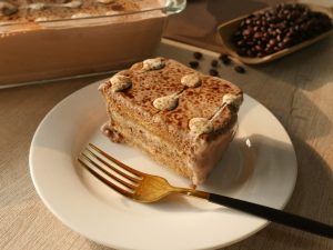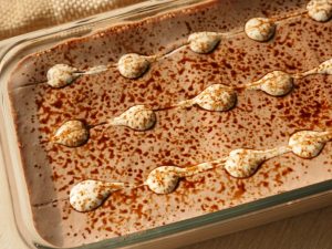 Now dip rusk one by one through the coffee+milk mixture to absorb the liquid then settle into a serving dish forming a bed.