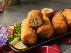 Dip into whisked egg & coat with breadcrumbs (makes 10-12).