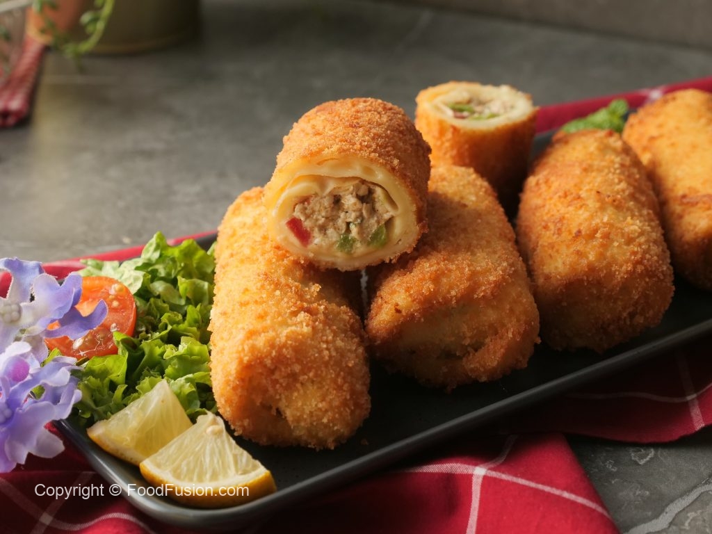 Crepe per cheddar cheese slice rakh dein aur tayyar creamy chicken filling (2-3 tbs) dal ker tamam sides ko fold ker ka roll ker lein.