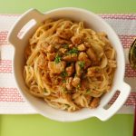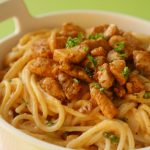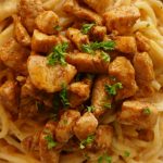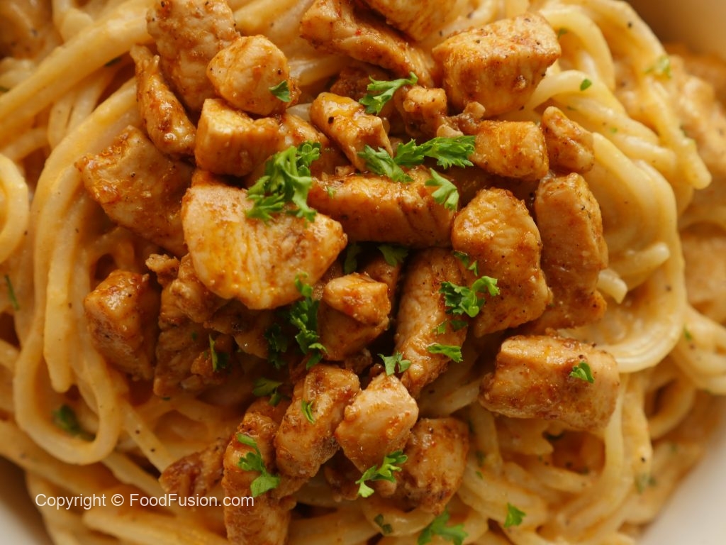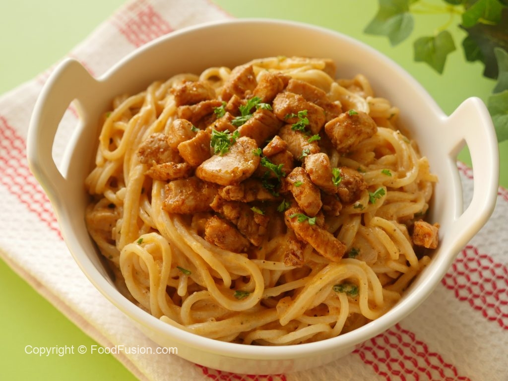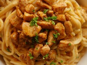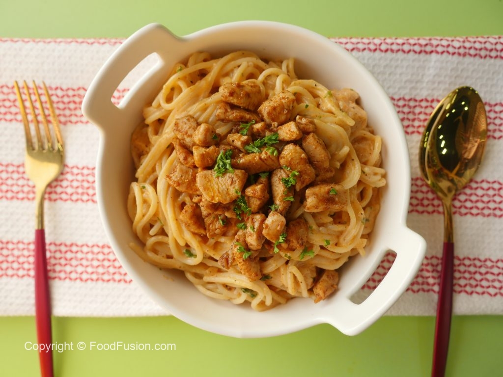 In serving dish,add creamy tomato spaghetti,cooked chicken,fresh parsley & serve!