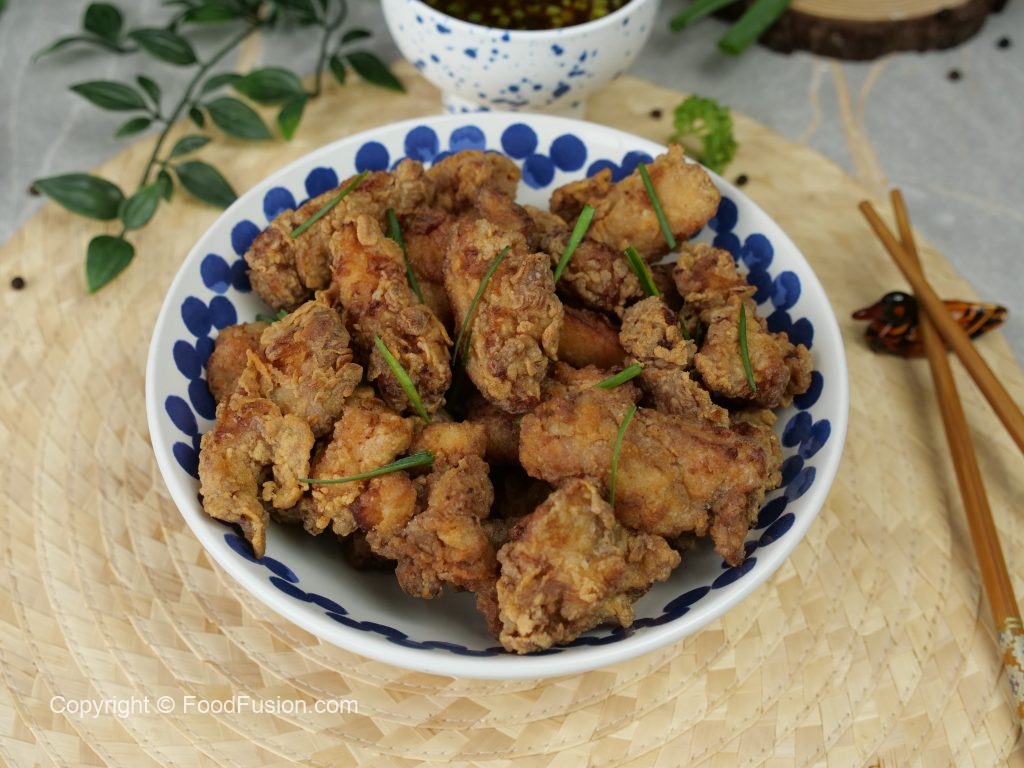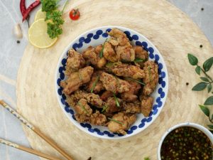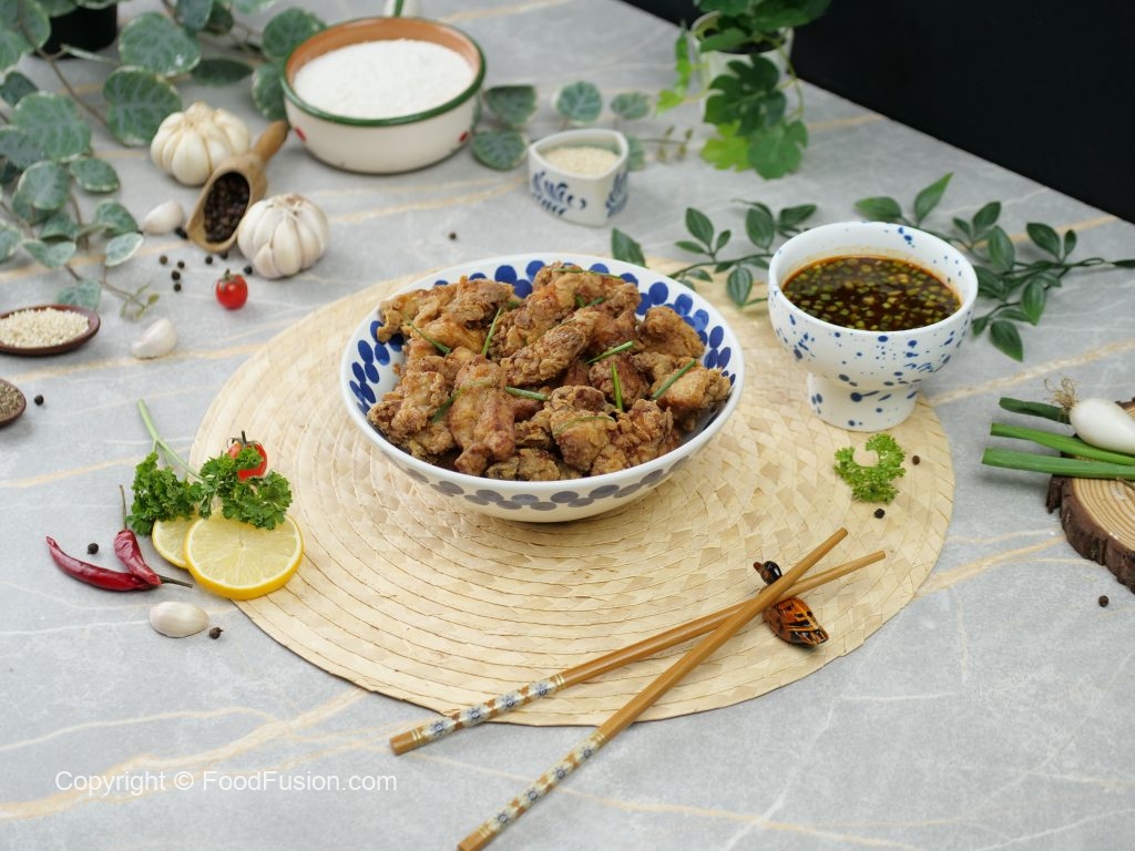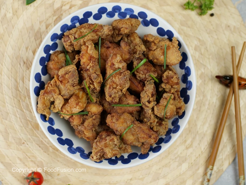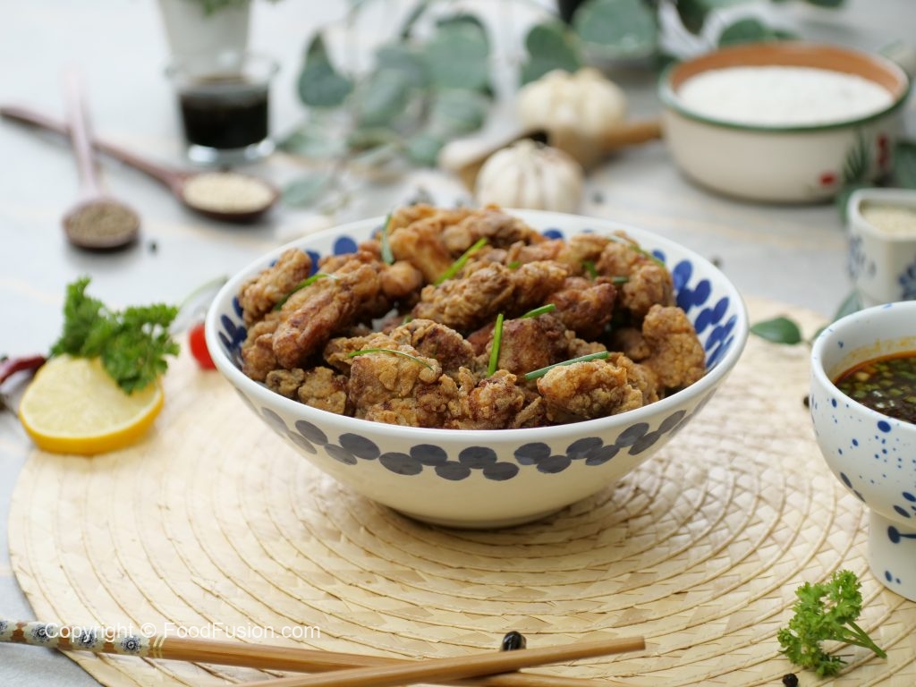 -In a bowl,add potato starch & coat each piece of marinated chicken in potato starch.
