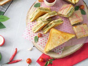 -Place cheddar cheese slices (cut into triangles) & spread prepared green chutney on another bread slice & flip it to make a sandwich.