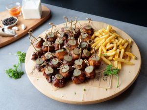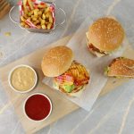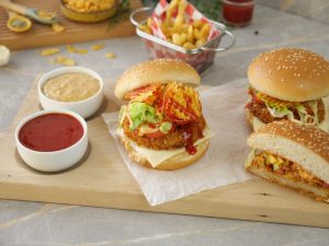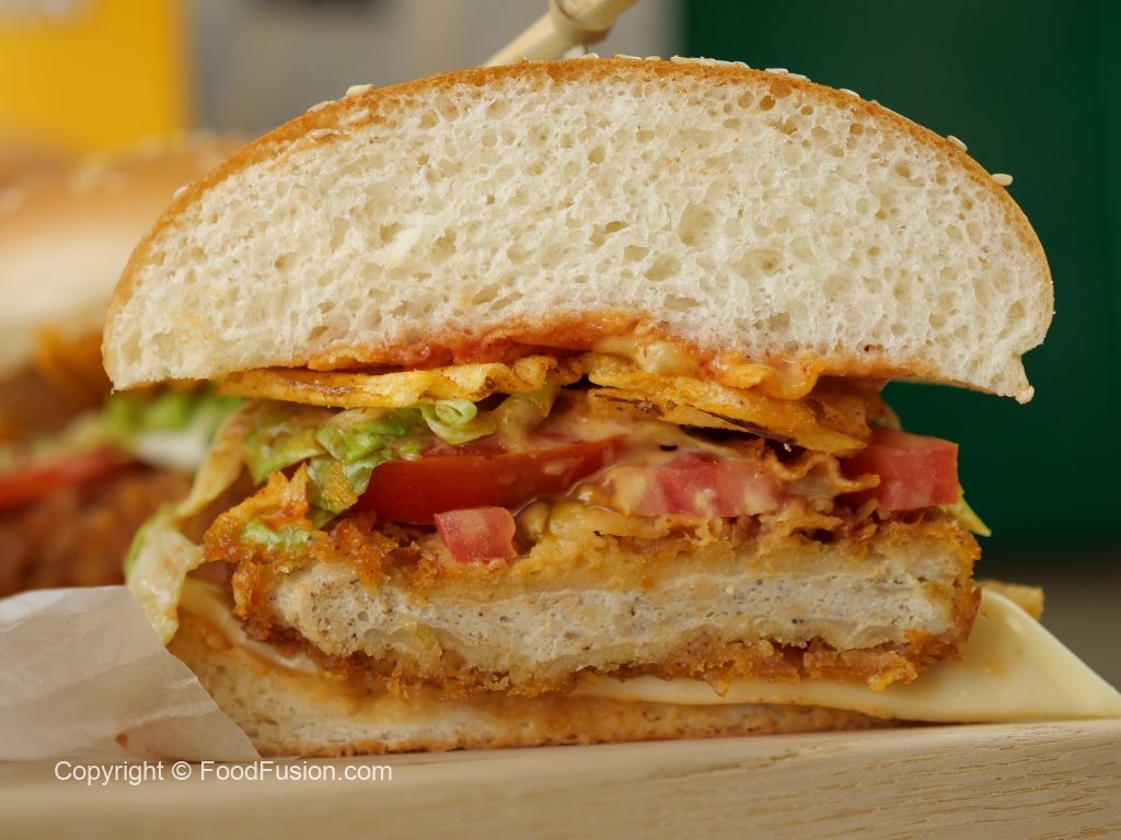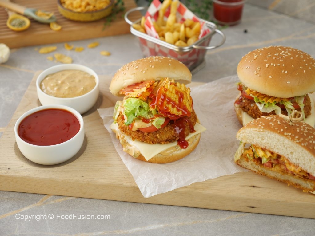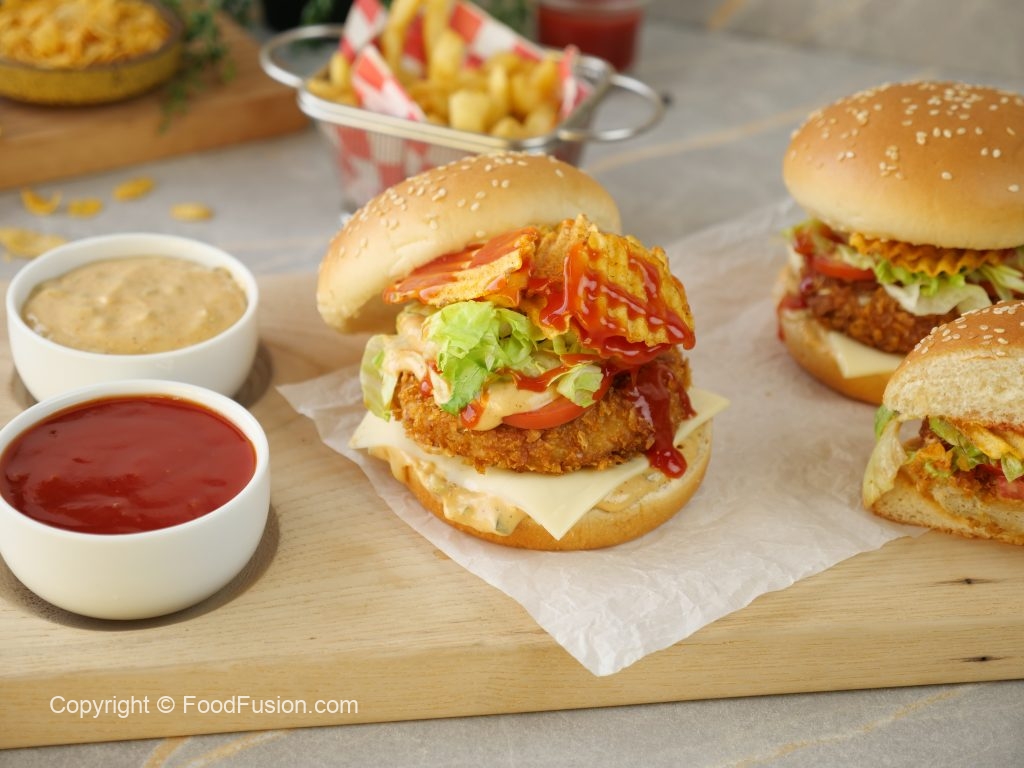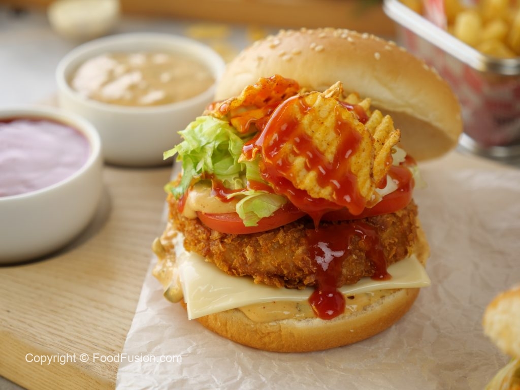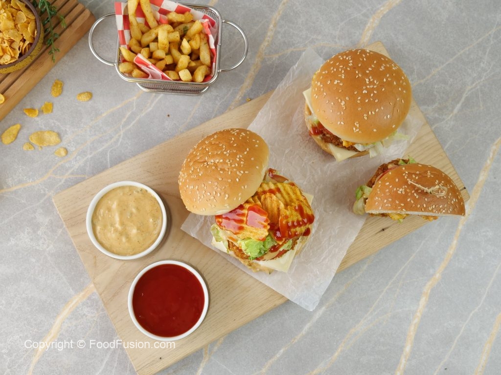 -On a burger bun,add & spread prepared fusion burger sauce,add cheddar cheese slice,fried crispy chicken patty,tomato slices,prepared fusion burger sauce,iceberg,chips,tomato ketchup & top with another burger bun.