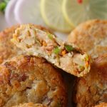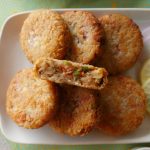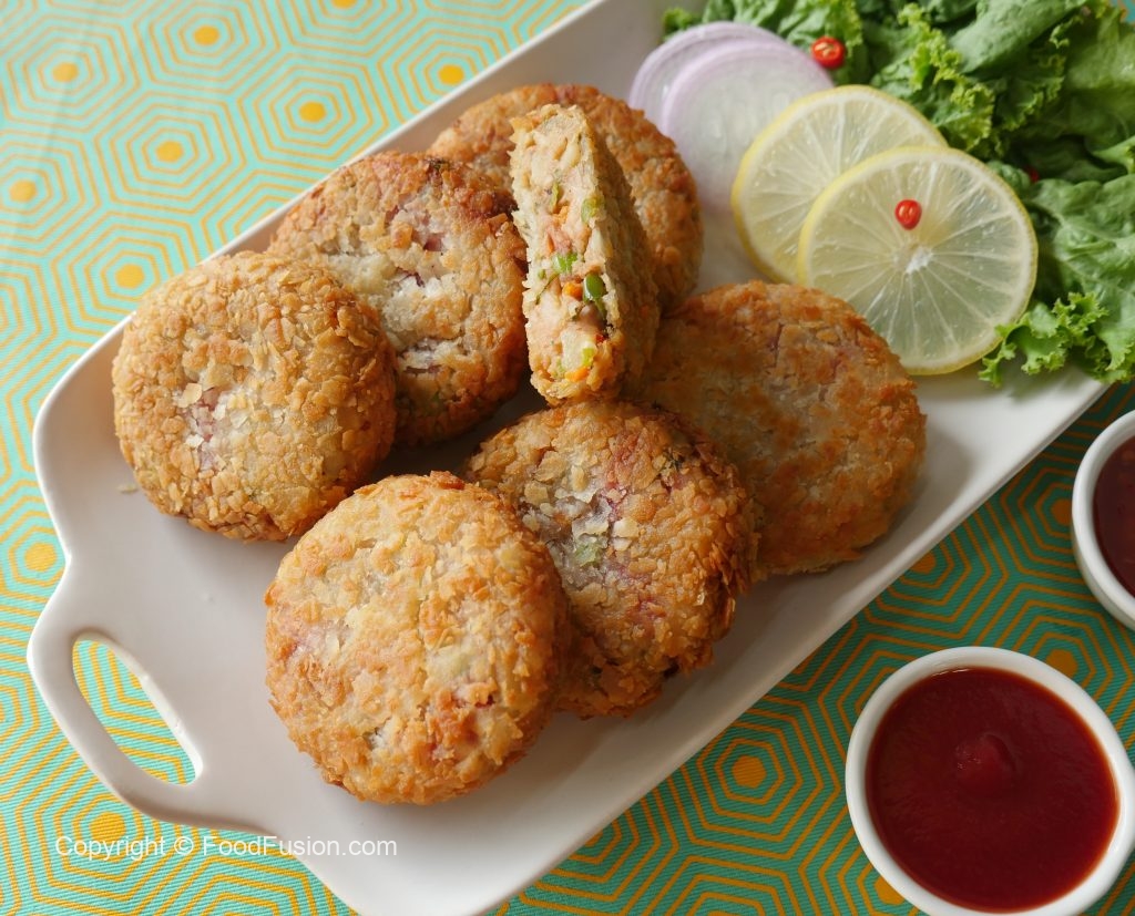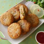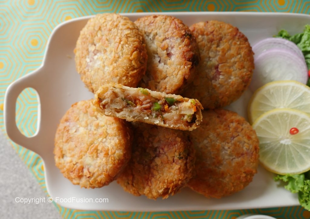 Grease hands with oil,taka a mixture and make cutlets of equal sizes then dip into all-purpose flour paste and coat in crumbled samosa/manda patti (makes 16-18).