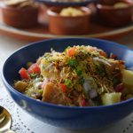 In serving plate,add papri,dumplings,chickpeas,potato,tomato,onion,salt,red chili crushed,chaat masala,cumin seeds,lemon juice,green chutney,date tamarind chutney,yogurt,chickpeas,papri,potato, tomato,onion,sev nimco,yogurt,green chutney,date tamarind chutney,green chutney,red chili crushed, salt,chaat masala,fresh coriander & serve!