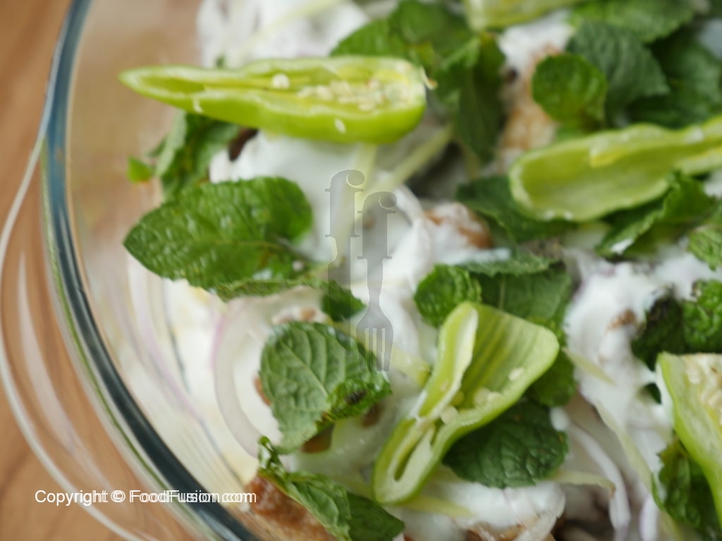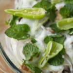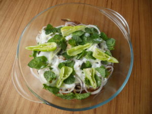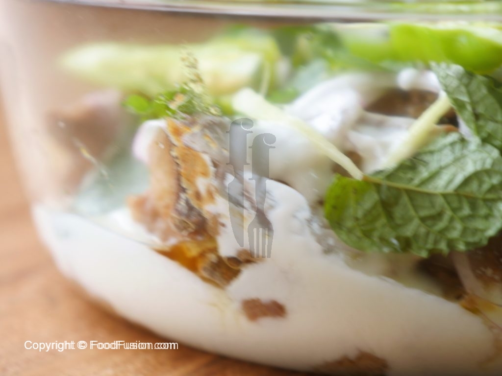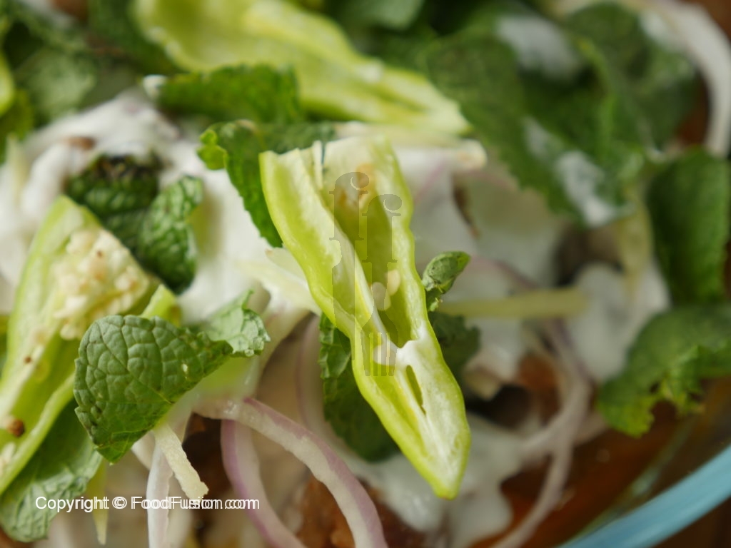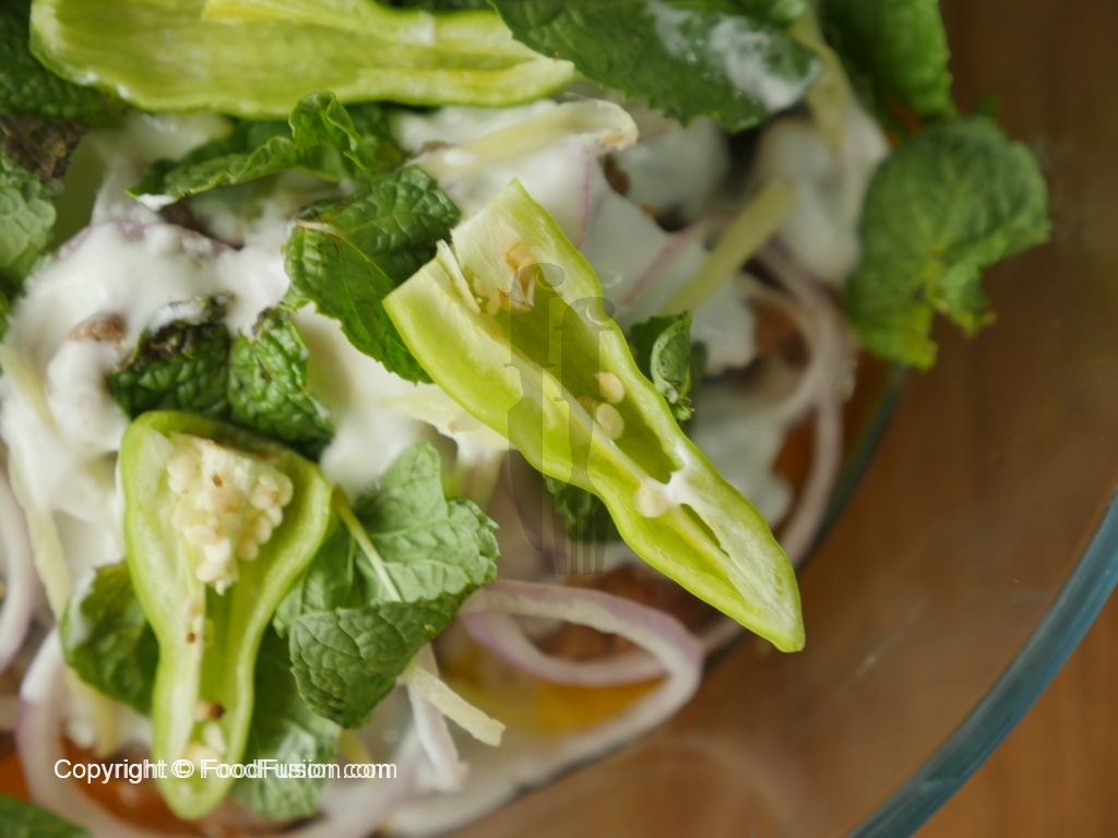Dish out in a serving dish,add onion rings,yogurt,ginger,mint leaves and green chilies.