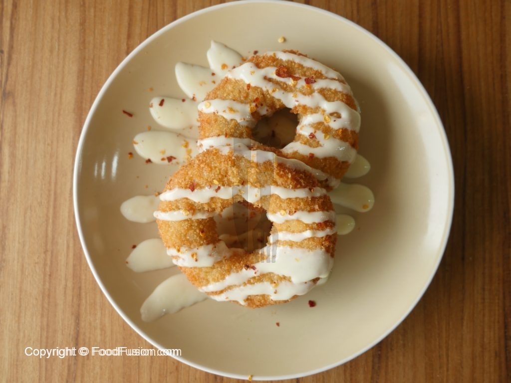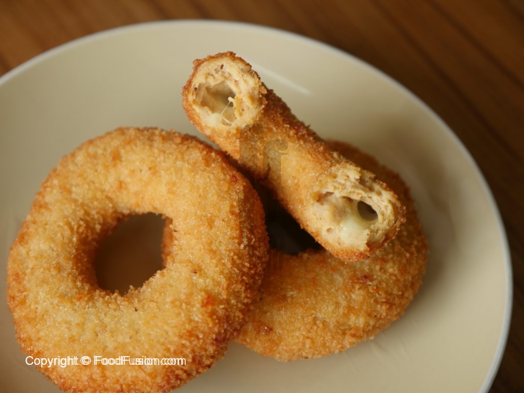 Mozzarella cheese slices ko doughnut ki shape mein rakh dein,halka sa press karein,haathon ko oil sa grease karein aur cheese ko completely mince mixture sa cover ker lein.