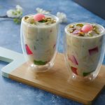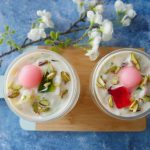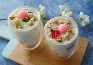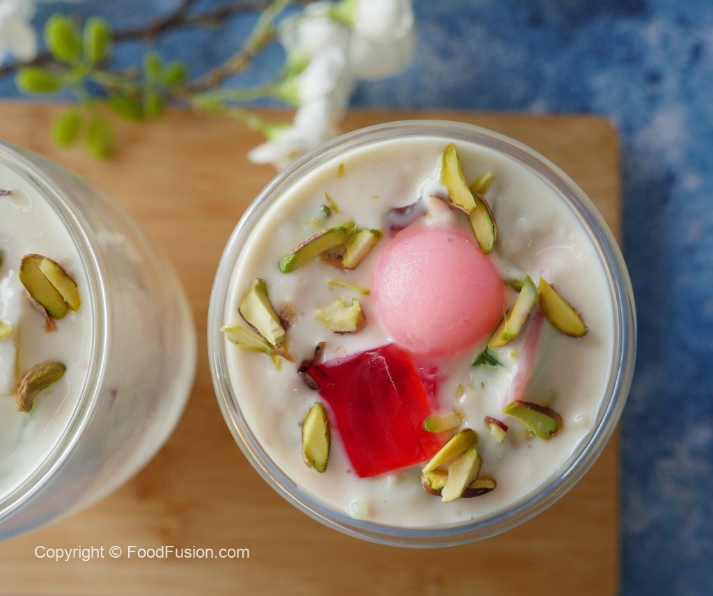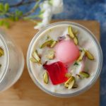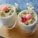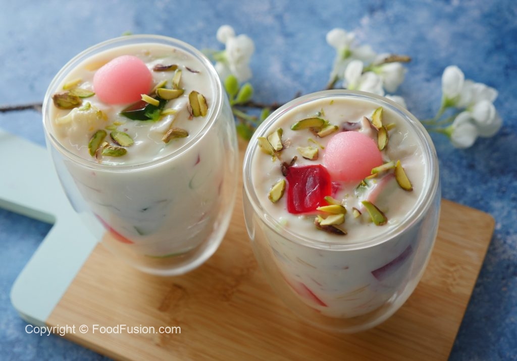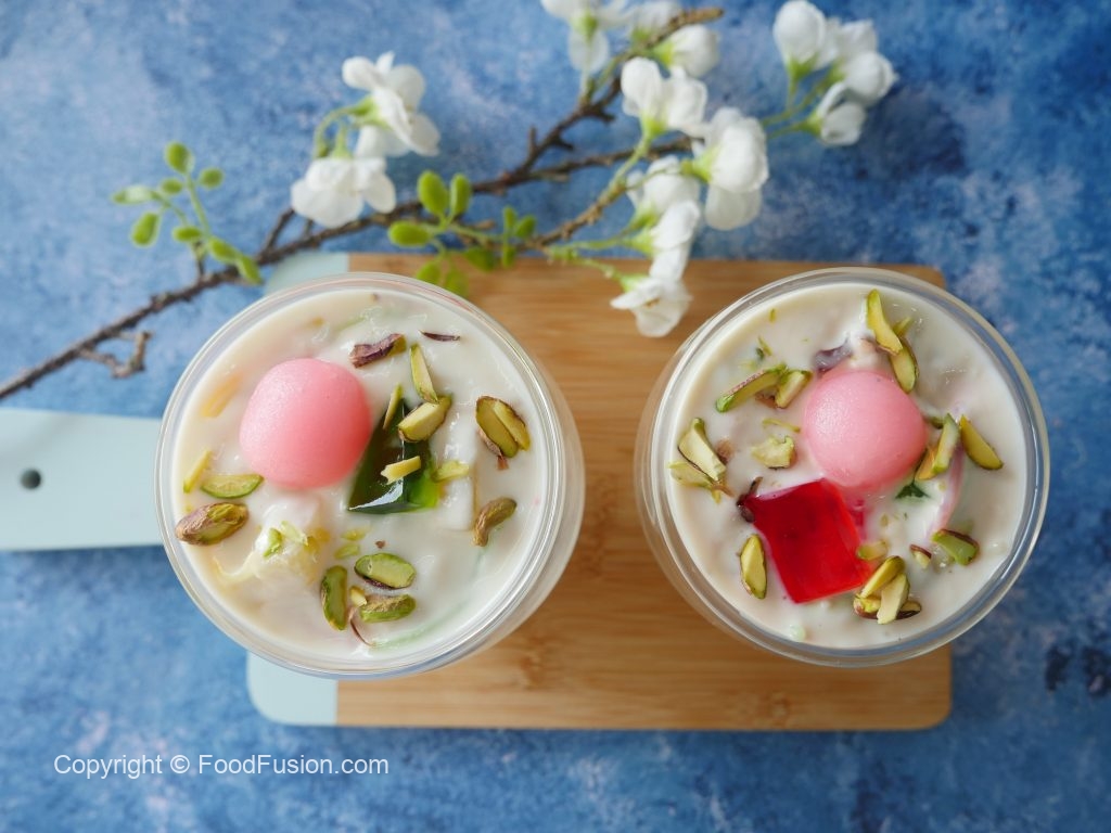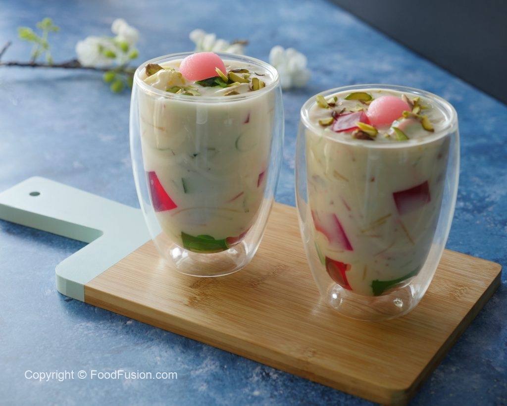 In serving glass,add red jelly cubes,green jelly cubes,doodh dulari and garnish with pink gulab jaman, pistachios & serve!