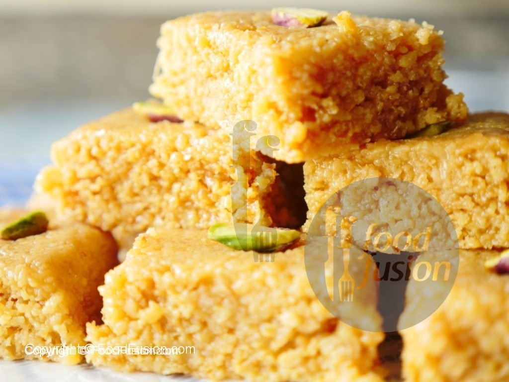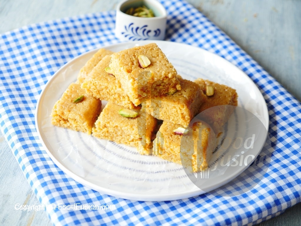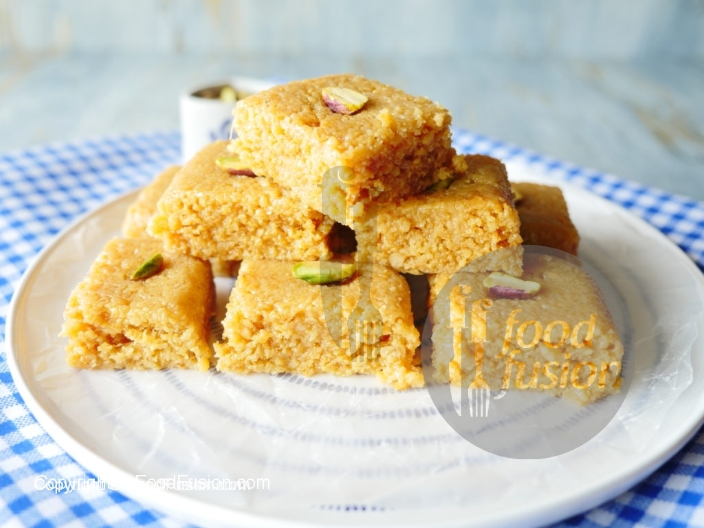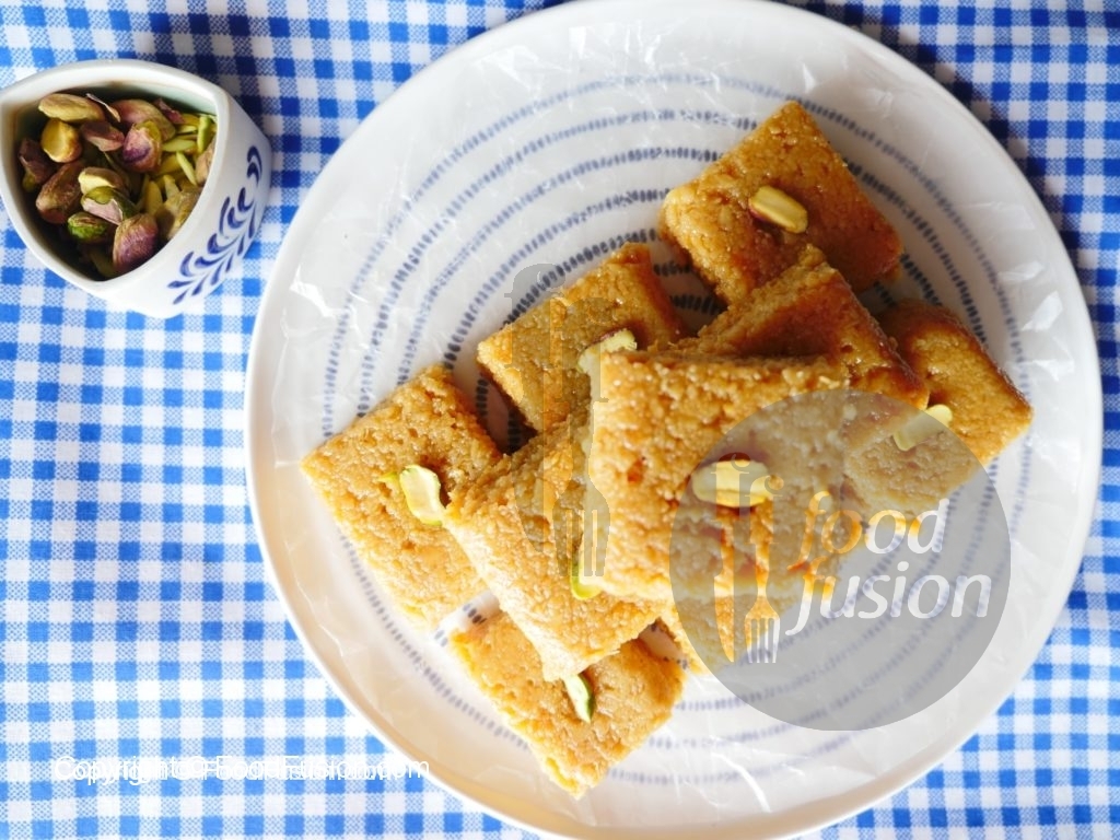 Desired shapes mein cut karein aur pista sa garnish ker ka serve karein.
