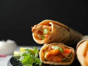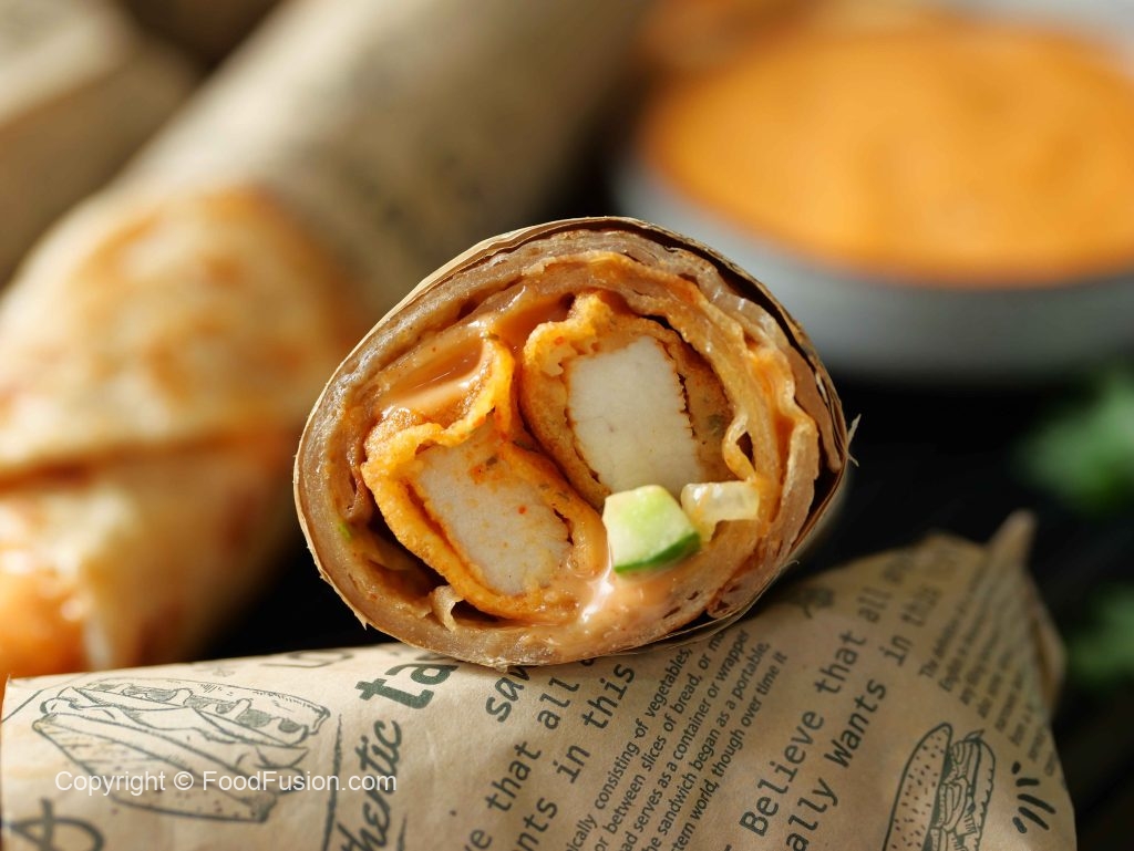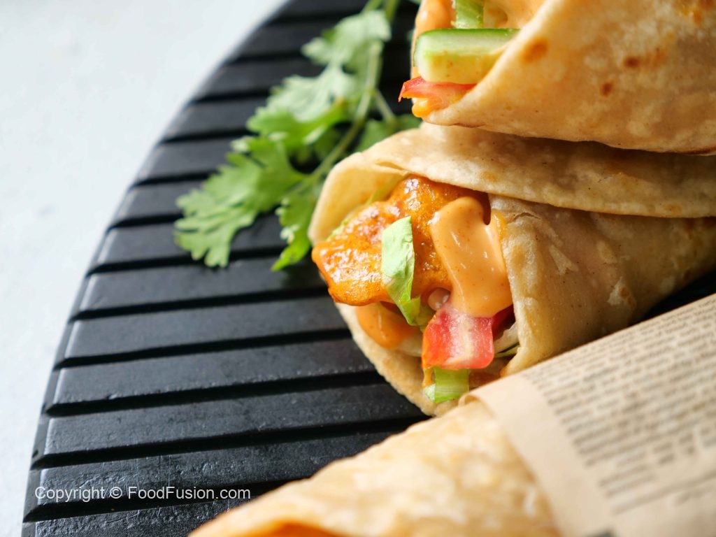-On paratha,add & spread dynamite sauce,iceberg,tomato,cucumber,dynamite chicken,fold & wrap in butter paper (makes 6-8 Paratha rolls).