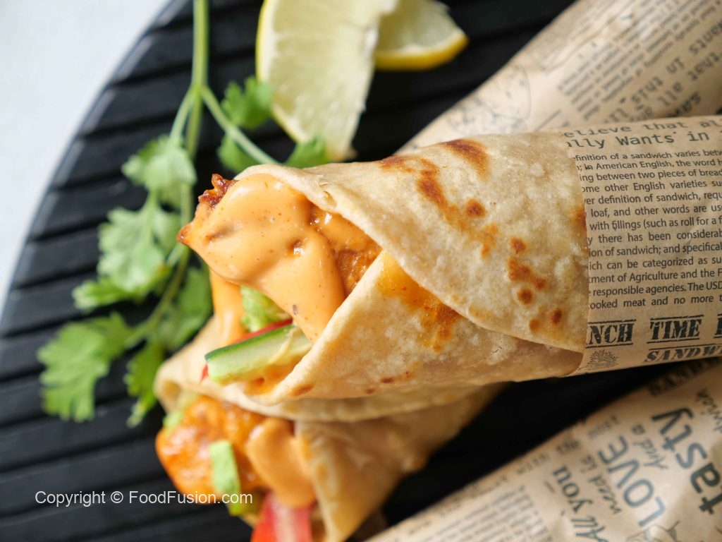 -Paratha per dynamite sauce dal ker pheela lein,iceberg,tamatar,kheera aur dynamite chicken dal kar fold karein aur butter paper mein wrap ker lein (makes 6-8 Paratha rolls).