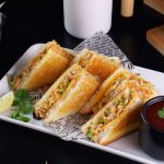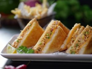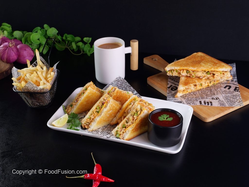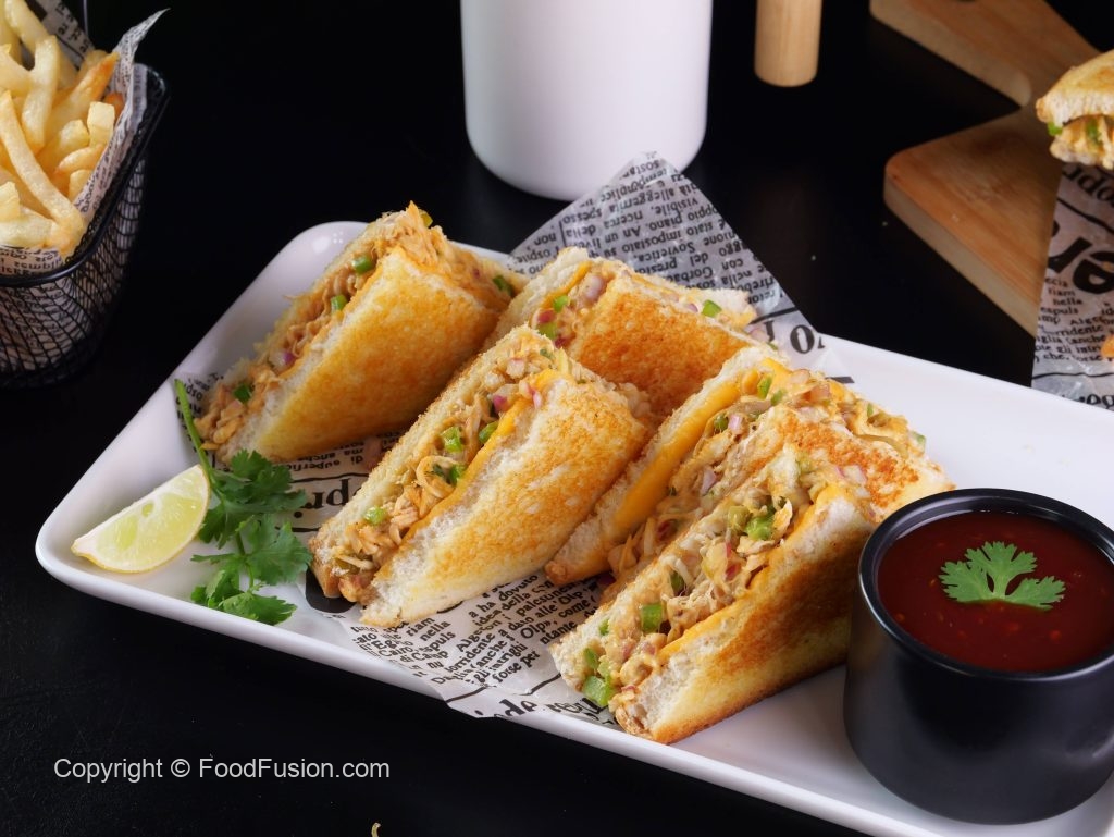 -Bread slice par chicken filling spread karein,cheese slice rakh kar dusri bread slice se cover karein, upar se melted butter brush karein.